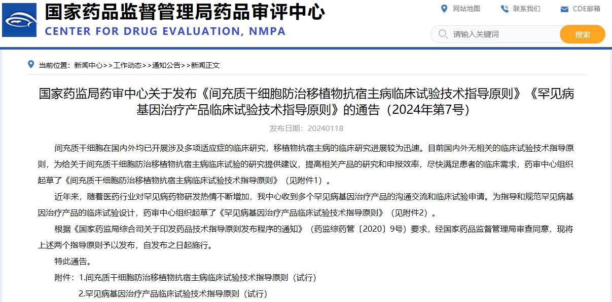 國家藥監(jiān)局藥審中心關(guān)于發(fā)布《間充質(zhì)干細(xì)胞防治移植物抗宿主病臨床試驗技術(shù)指導(dǎo)原則》《罕見病基因治療產(chǎn)品臨床試驗技術(shù)指導(dǎo)原則》的通告(2024年第7號)