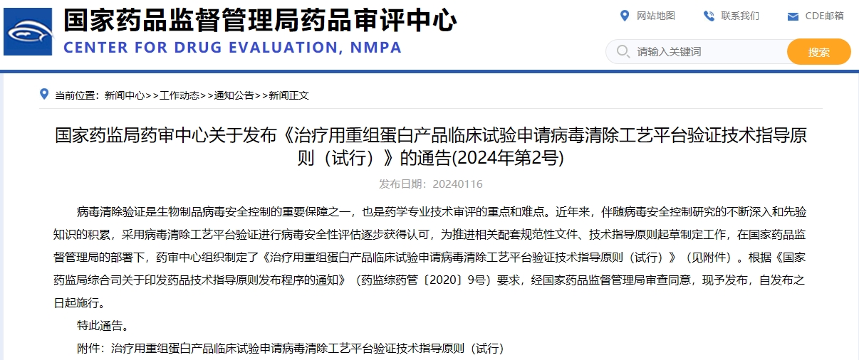 國家藥監(jiān)局藥審中心關(guān)于發(fā)布《治療用重組蛋白產(chǎn)品臨床試驗申請病毒清除工藝平臺驗證技術(shù)指導(dǎo)原則(試行)》的通告(2024年第2號)