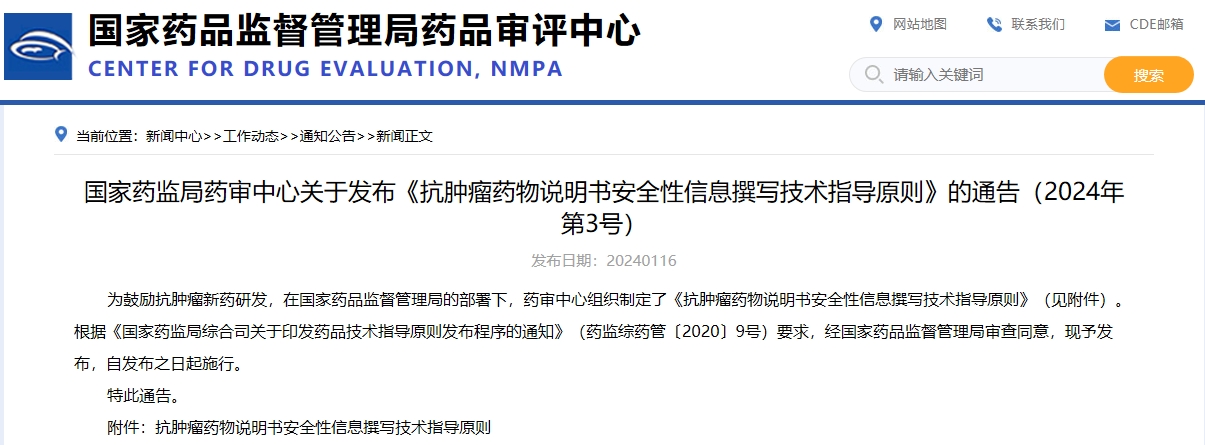 國家藥監(jiān)局藥審中心關(guān)于發(fā)布《抗腫瘤藥物說明書安全性信息撰寫技術(shù)指導(dǎo)原則》的通告(2024年第3號)
