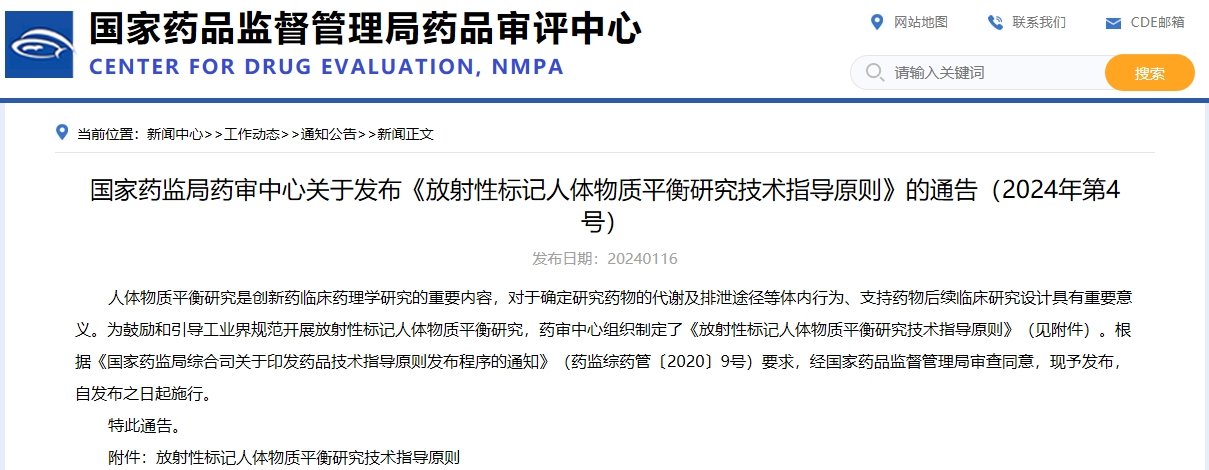 國家藥監(jiān)局藥審中心關(guān)于發(fā)布《放射性標(biāo)記人體物質(zhì)平衡研究技術(shù)指導(dǎo)原則》的通告(2024年第4號)