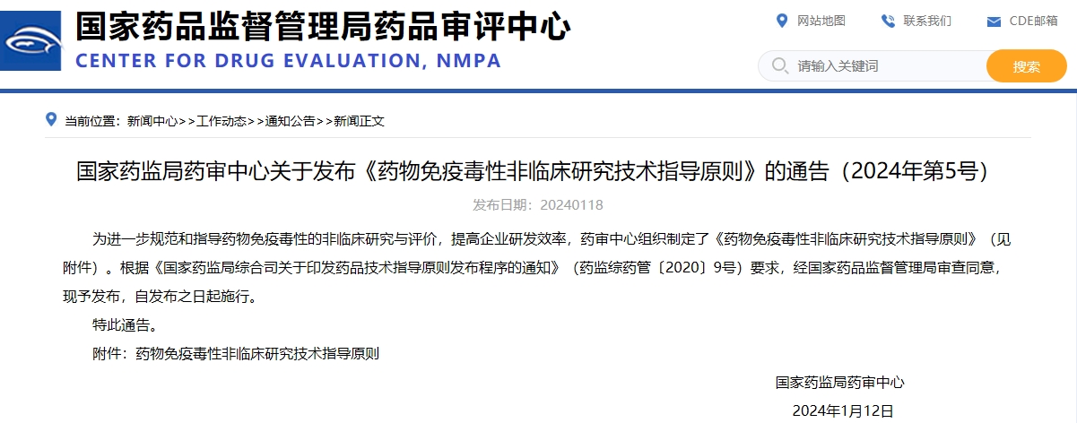 國家藥監(jiān)局藥審中心關(guān)于發(fā)布《藥物免疫毒性非臨床研究技術(shù)指導(dǎo)原則》的通告(2024年第5號)