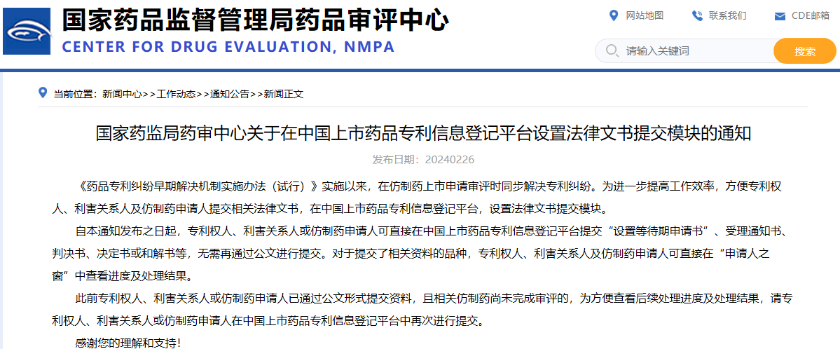 國家藥監(jiān)局藥審中心關(guān)于在中國上市藥品專利信息登記平臺設(shè)置法律文書提交模塊的通知
