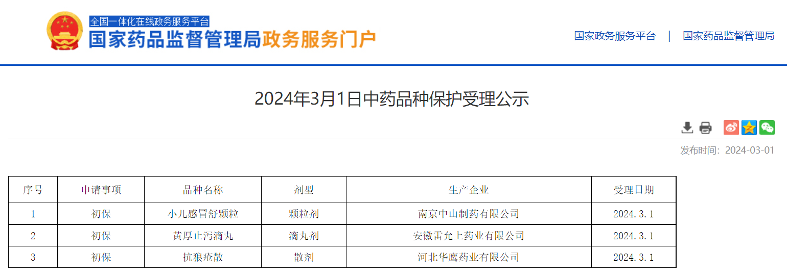 2024年3月1日中藥品種保護(hù)受理公示