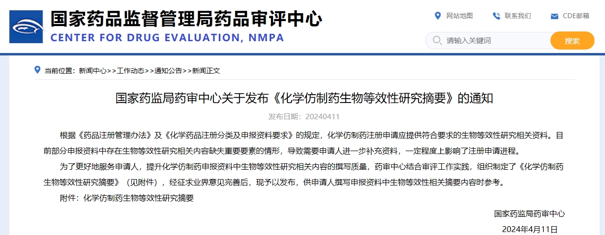 國家藥監(jiān)局藥審中心關(guān)于發(fā)布《化學仿制藥生物等效性研究摘要》的通知