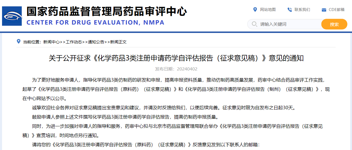 關(guān)于公開征求《化學藥品3類注冊申請藥學自評估報告(征求意見稿)》意見的通知