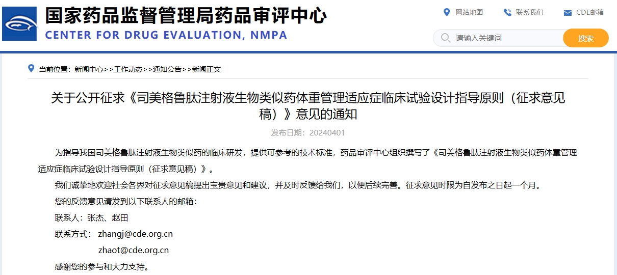 關(guān)于公開征求《司美格魯肽注射液生物類似藥體重管理適應(yīng)癥臨床試驗設(shè)計指導原則(征求意見稿)》意見的通知