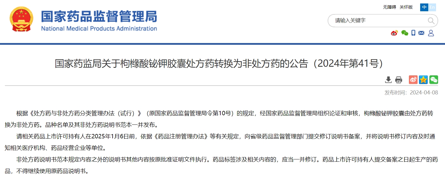 國家藥監(jiān)局關(guān)于枸櫞酸鉍鉀膠囊處方藥轉(zhuǎn)換為非處方藥的公告(2024年第41號)