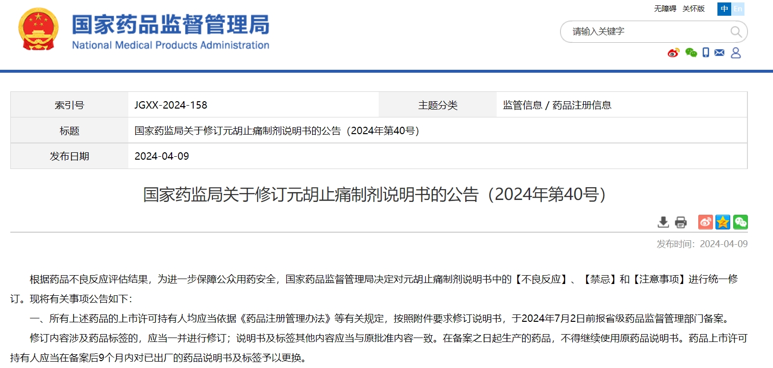 國家藥監(jiān)局關(guān)于修訂元胡止痛制劑說明書的公告(2024年第40號)