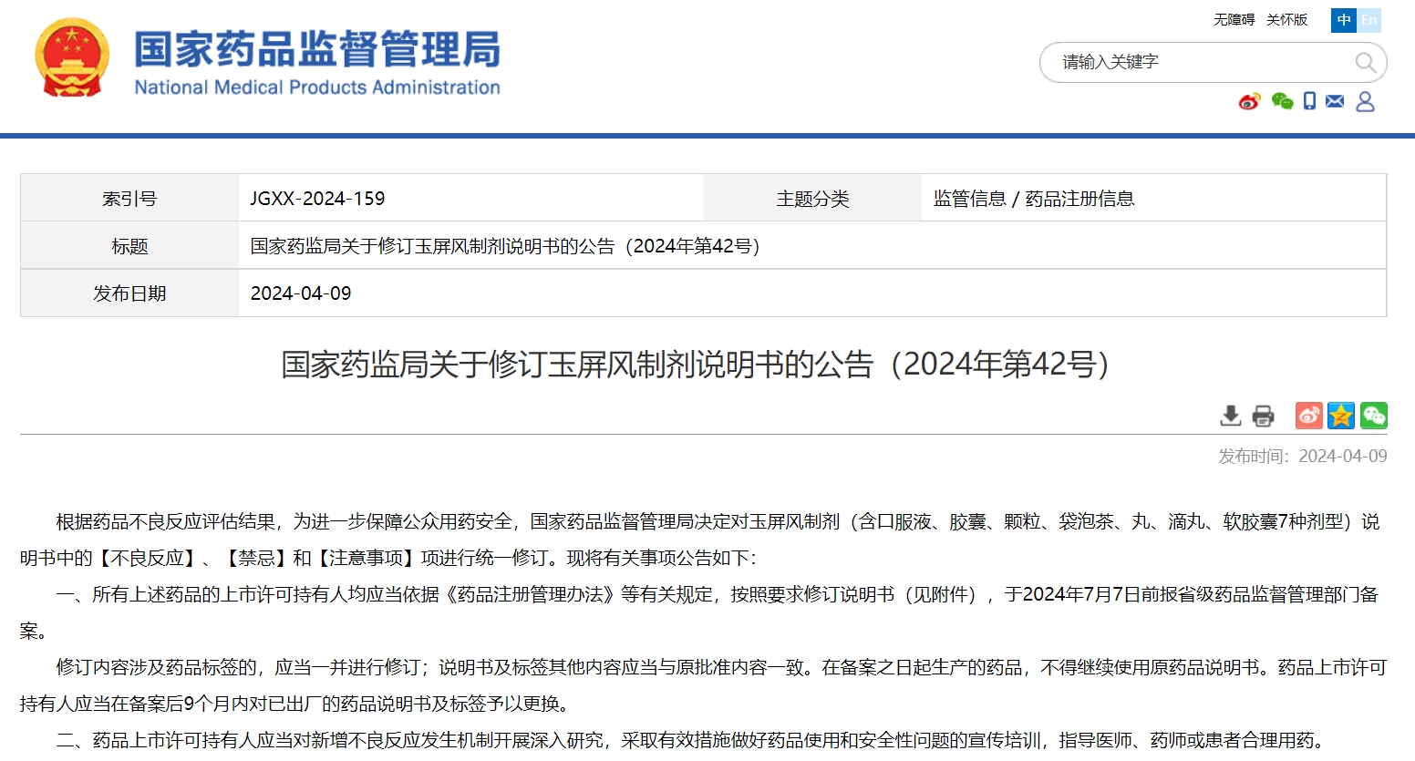 國家藥監(jiān)局關(guān)于修訂玉屏風制劑說明書的公告(2024年第42號)