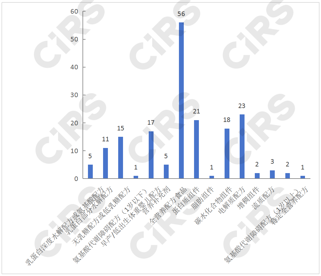 目前,已獲批產(chǎn)品中有54款為特殊醫(yī)學(xué)用途嬰兒配方食品,占到了總數(shù)的30%,包括5款乳蛋白深度水解配方或氨基酸配方、11款乳蛋白部分水解配方、15款無(wú)乳糖或低乳糖配方、1款氨基酸代謝障礙配方、17款早產(chǎn)/低出生體重嬰兒配方、5款營(yíng)養(yǎng)補(bǔ)充劑;70款為非全營(yíng)養(yǎng)配方食品,包括21款蛋白質(zhì)組件、1款脂肪組件、18款碳水化合物組件、23款電解質(zhì)配方、2款增稠組件、3款流質(zhì)配方、2款氨基酸代謝障礙配方(1歲以上),占總數(shù)的39%;56款為全營(yíng)養(yǎng)配方食品,占總數(shù)的32%,包括9款全營(yíng)養(yǎng)配方食品(1-10歲)和47款全營(yíng)養(yǎng)配方食品(1歲以上);特定全營(yíng)養(yǎng)配方食品僅有1款,為速熠素特殊醫(yī)學(xué)用途腫瘤全營(yíng)養(yǎng)配方食品。