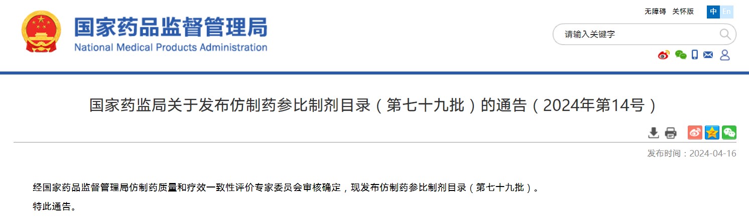 國家藥監(jiān)局關(guān)于發(fā)布仿制藥參比制劑目錄(第七十九批)的通告(2024年第14號(hào))