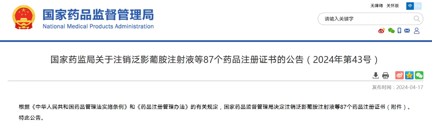 國家藥監(jiān)局關(guān)于注銷泛影葡胺注射液等87個(gè)藥品注冊(cè)證書的公告(2024年第43號(hào))