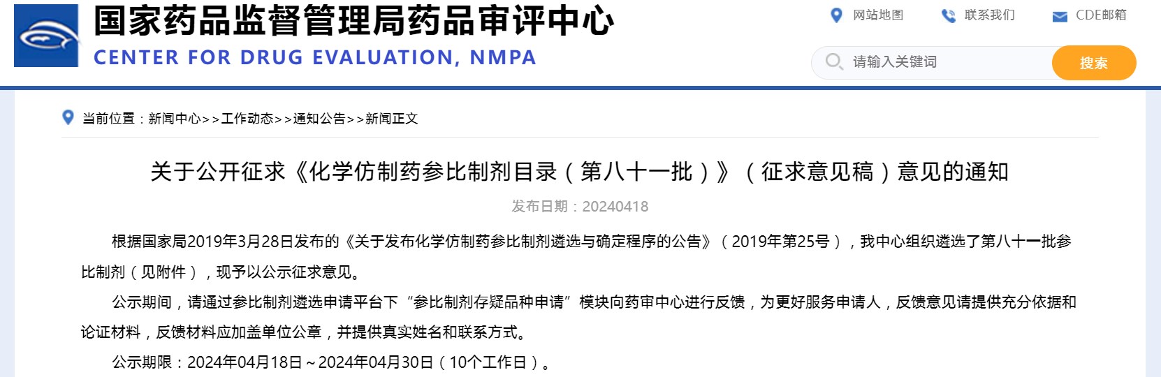 關(guān)于公開征求《化學(xué)仿制藥參比制劑目錄(第八十一批)》(征求意見稿)意見的通知