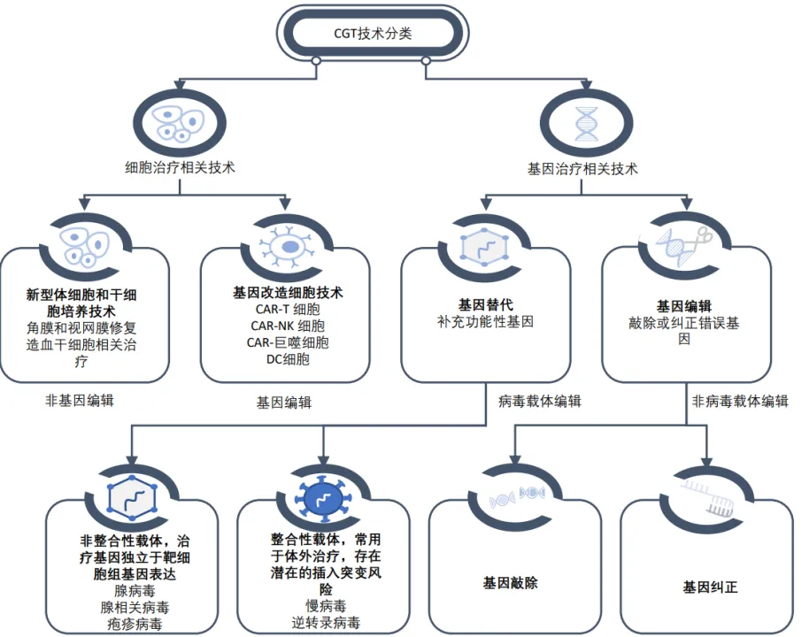 過去30多年來, CGT領域抵住一個又一個時間節(jié)點的考驗逐步蛻變。從1990年代首項相關臨床試驗啟動,到2000年代因出現(xiàn)嚴重不良反應,整個領域遇冷,之后在人才、資本和政策的多重利好下,CGT重煥新生。數(shù)十款包括CAR-T療法、干細胞療法、溶瘤病毒療法和基因療法等在內的創(chuàng)新產(chǎn)品涌現(xiàn),帶動了產(chǎn)業(yè)鏈上下游發(fā)展。