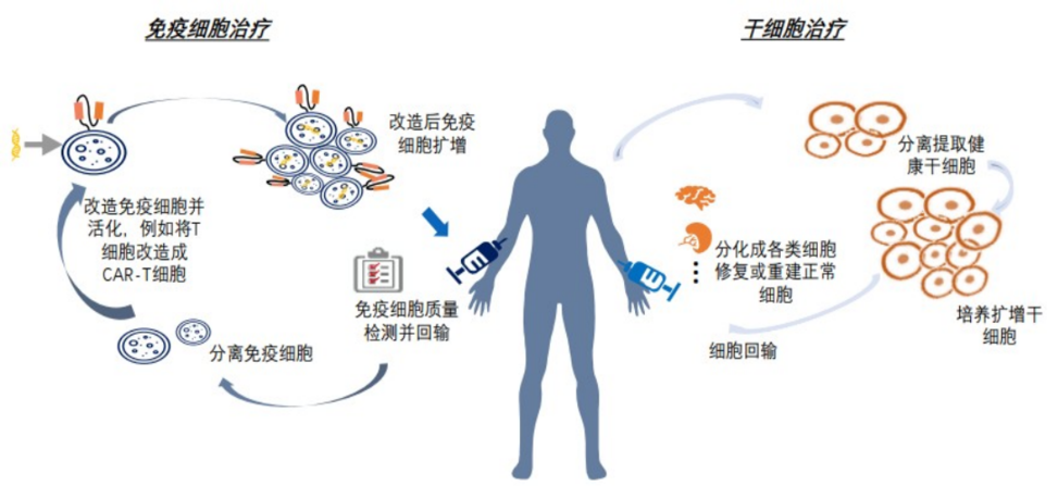 細胞治療是指應用人自體或異體來源的細胞經(jīng)體外操作后輸入(或植入)人體,用于疾病治療的過程。體外操作包括但不限于分離、純化、培養(yǎng)、擴增、活化、細胞(系)的建立、凍存復蘇等。細胞治療主要可分為免疫細胞治療、干細胞治療和其它體細胞治療。