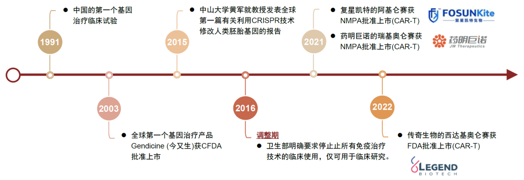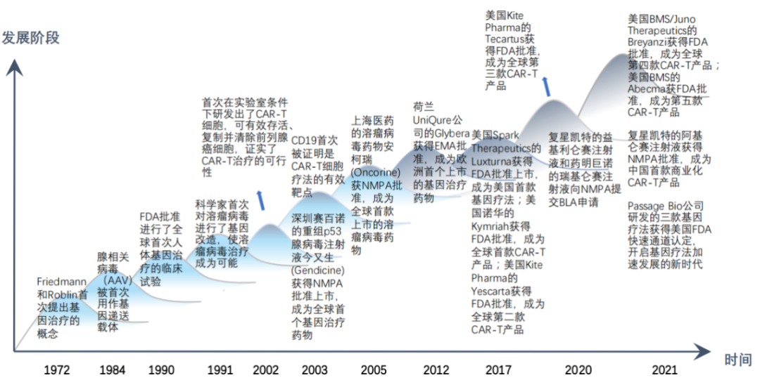 我國細胞與基因治療在20世紀90年代已有臨床研究,至2005年有兩款針對實體瘤的CGT產(chǎn)品,但是之后幾年熱度消散,直到2010年后細胞治療開始受到各大藥企及研發(fā)機構的青睞。2016年,魏則西事件一度導致一些細胞免疫管線研發(fā)進展滯后,然而隨著相關技術指導與監(jiān)管體系的完善,CGT發(fā)展迅速,大量CGT產(chǎn)品進入臨床試驗,生物技術公司爭相布局CGT產(chǎn)業(yè),復星凱特的阿基侖賽注射液于2021年6月獲得NMPA批準,成為中國首款上市的CAR-T產(chǎn)品。2022年傳奇生物的CAR-T產(chǎn)品西達基奧侖賽獲FDA批準上市。