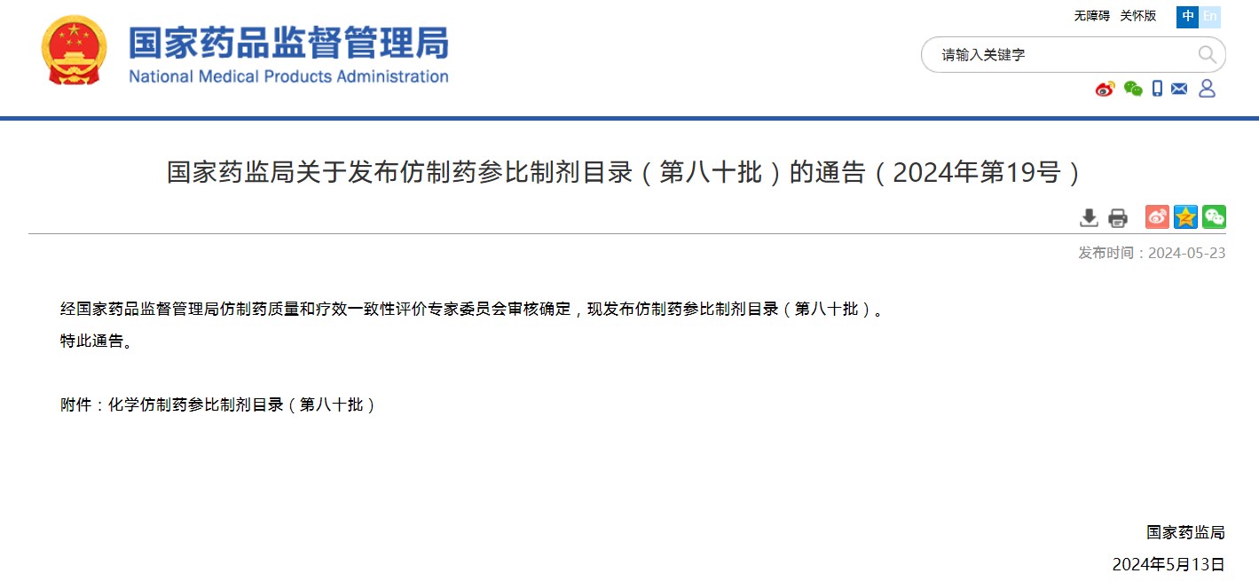 國家藥監(jiān)局關(guān)于發(fā)布仿制藥參比制劑目錄(第八十批)的通告(2024年第19號(hào))