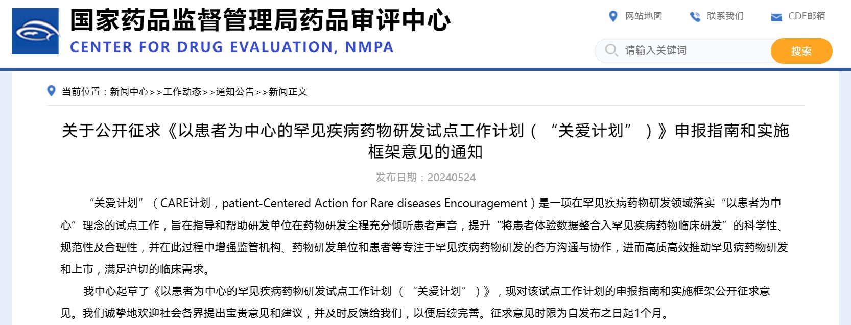 關(guān)于公開征求《以患者為中心的罕見疾病藥物研發(fā)試點(diǎn)工作計(jì)劃(“關(guān)愛計(jì)劃”)》申報(bào)指南和實(shí)施框架意見的通知