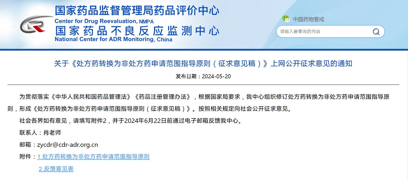 關(guān)于《處方藥轉(zhuǎn)換為非處方藥申請(qǐng)范圍指導(dǎo)原則(征求意見稿)》上網(wǎng)公開征求意見的通知