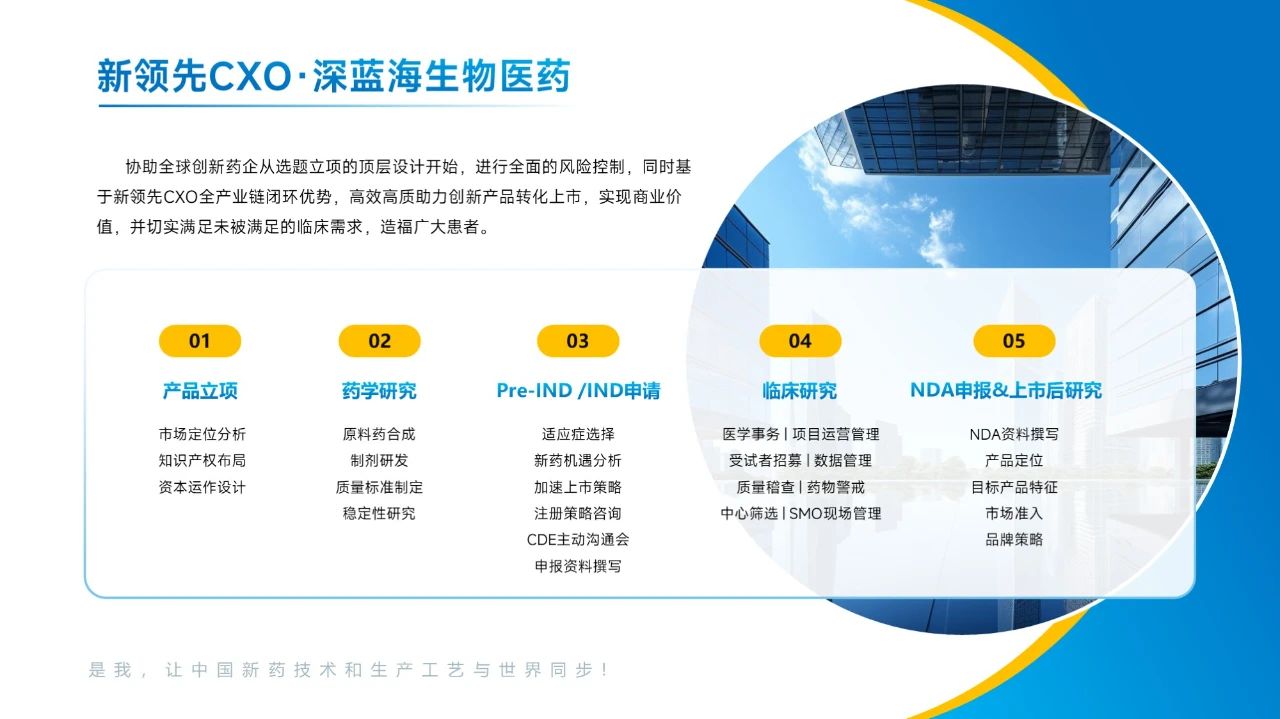 深藍(lán)海生物醫(yī)藥是新領(lǐng)先醫(yī)藥(股票代碼600222 )在臨床 CRO 領(lǐng)域的子品牌,成立于 2007 年,秉持“以終為始,頂層設(shè)計,做新藥創(chuàng)制的全程合作伙伴"的服務(wù)理念,為全球藥企提供覆蓋生物藥、化藥、中藥、醫(yī)療器械、細(xì)胞與基因治療等I-III期臨床研究、生物等效性研究、上市后研究、第三方稽查、IND和NDA申報以及醫(yī)學(xué)事務(wù)等服務(wù)??蓾M足不同研發(fā)型企業(yè)的臨床研究定制需求,為國內(nèi)外客戶打通新藥上市前關(guān)鍵瓶頸。