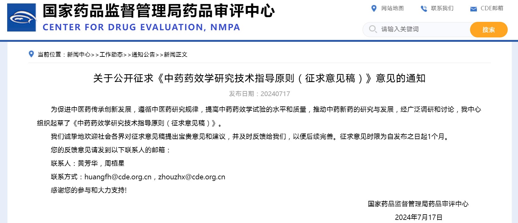 關(guān)于公開征求《中藥藥效學(xué)研究技術(shù)指導(dǎo)原則(征求意見稿)》意見的通知