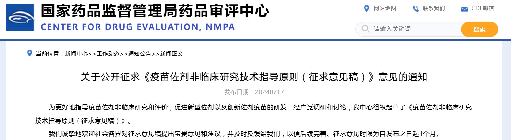 關(guān)于公開征求《疫苗佐劑非臨床研究技術(shù)指導(dǎo)原則(征求意見稿)》意見的通知