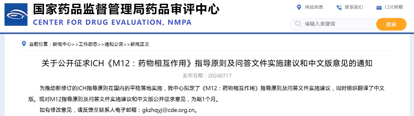 關(guān)于公開征求ICH《M12:藥物相互作用》指導(dǎo)原則及問答文件實施建議和中文版意見的通知