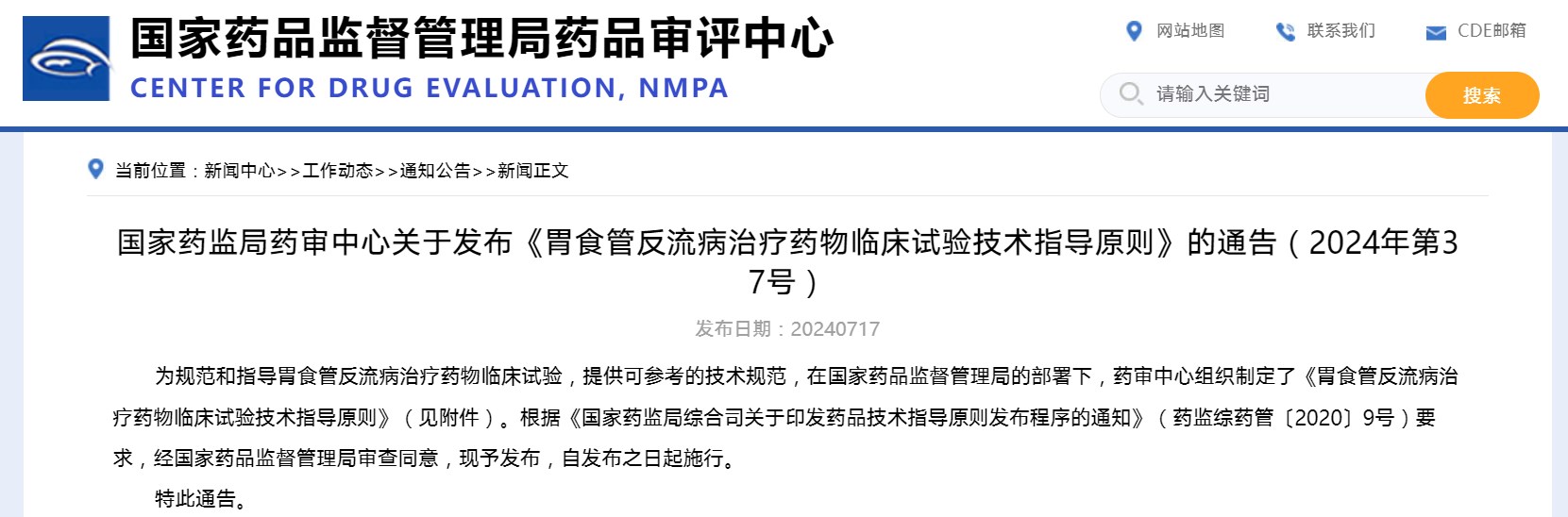 國家藥監(jiān)局藥審中心關(guān)于發(fā)布《胃食管反流病治療藥物臨床試驗技術(shù)指導(dǎo)原則》的通告(2024年第37號)
