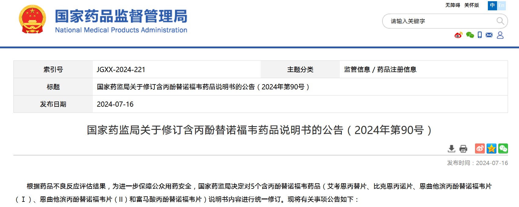 國家藥監(jiān)局關(guān)于修訂含丙酚替諾福韋藥品說明書的公告(2024年第90號)