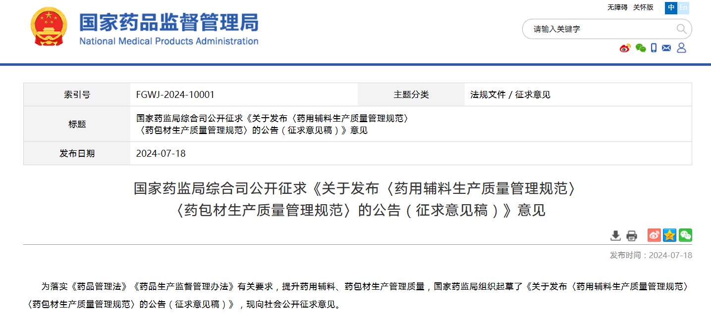 國家藥監(jiān)局綜合司公開征求《關(guān)于發(fā)布〈藥用輔料生產(chǎn)質(zhì)量管理規(guī)范〉〈藥包材生產(chǎn)質(zhì)量管理規(guī)范〉的公告(征求意見稿)》意見