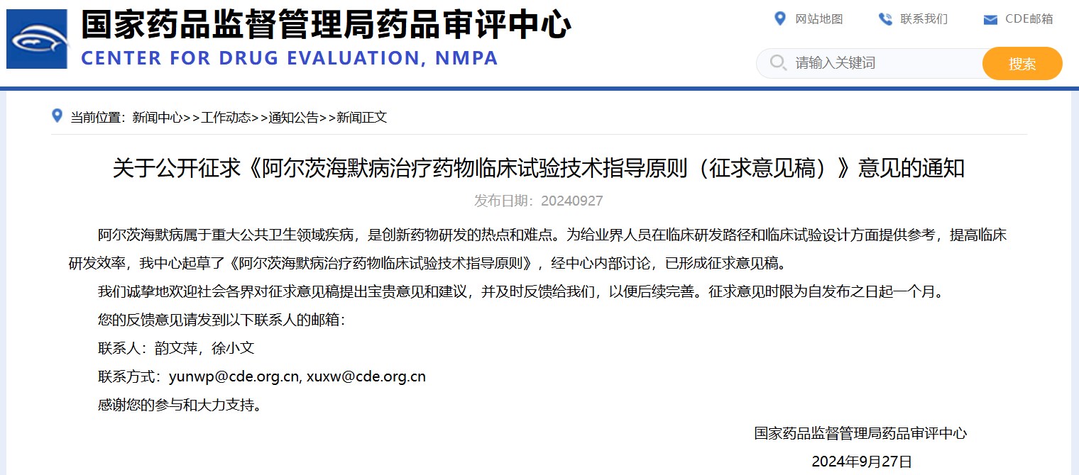 關(guān)于公開征求《阿爾茨海默病治療藥物臨床試驗(yàn)技術(shù)指導(dǎo)原則(征求意見稿)》意見的通知