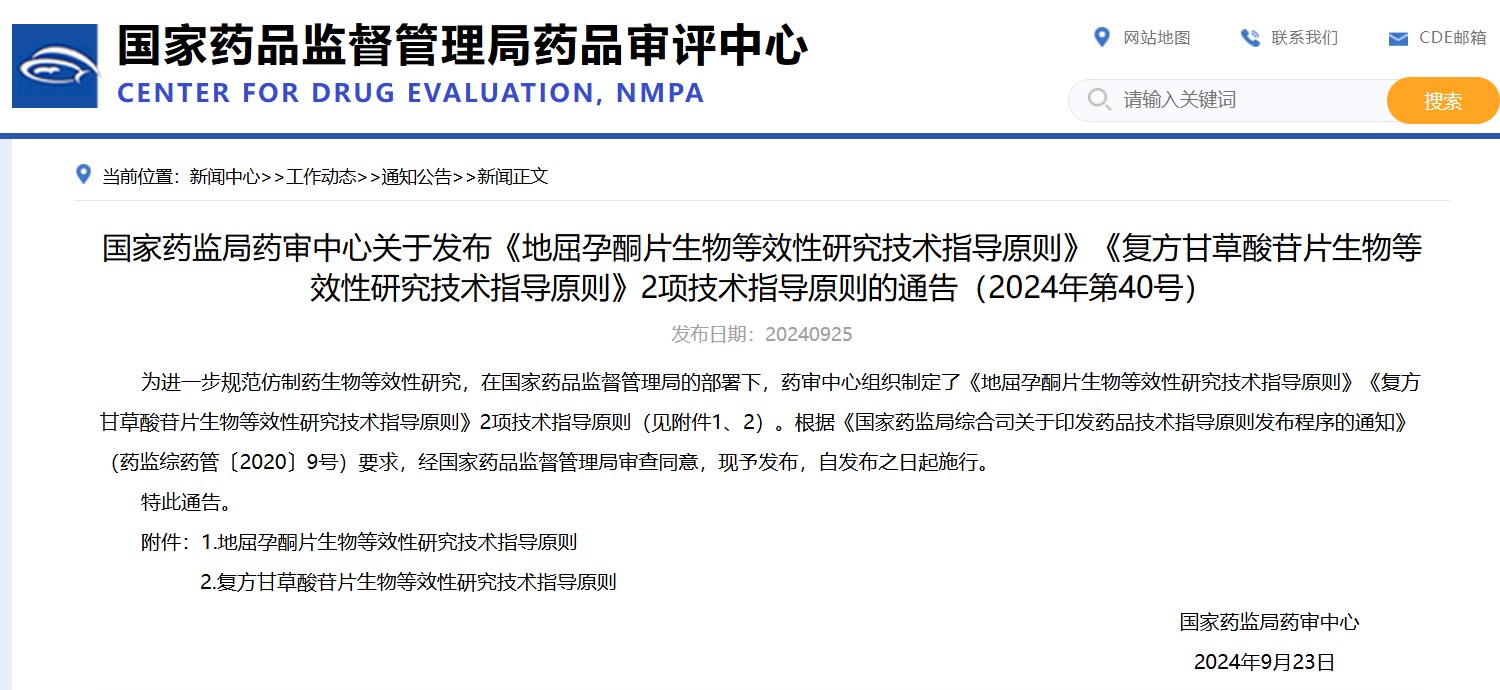 國家藥監(jiān)局藥審中心關(guān)于發(fā)布《地屈孕酮片生物等效性研究技術(shù)指導(dǎo)原則》《復(fù)方甘草酸苷片生物等效性研究技術(shù)指導(dǎo)原則》2項(xiàng)技術(shù)指導(dǎo)原則的通告(2024年第40號)