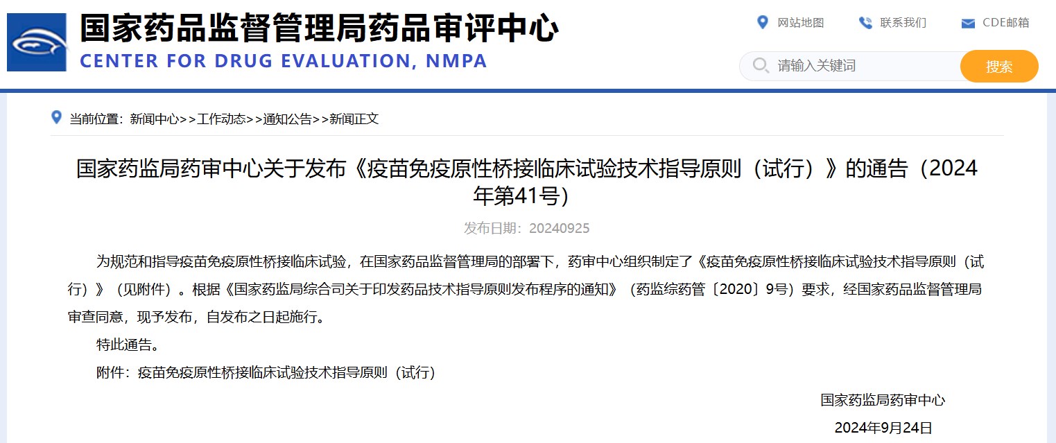 國家藥監(jiān)局藥審中心關(guān)于發(fā)布《疫苗免疫原性橋接臨床試驗(yàn)技術(shù)指導(dǎo)原則(試行)》的通告(2024年第41號)