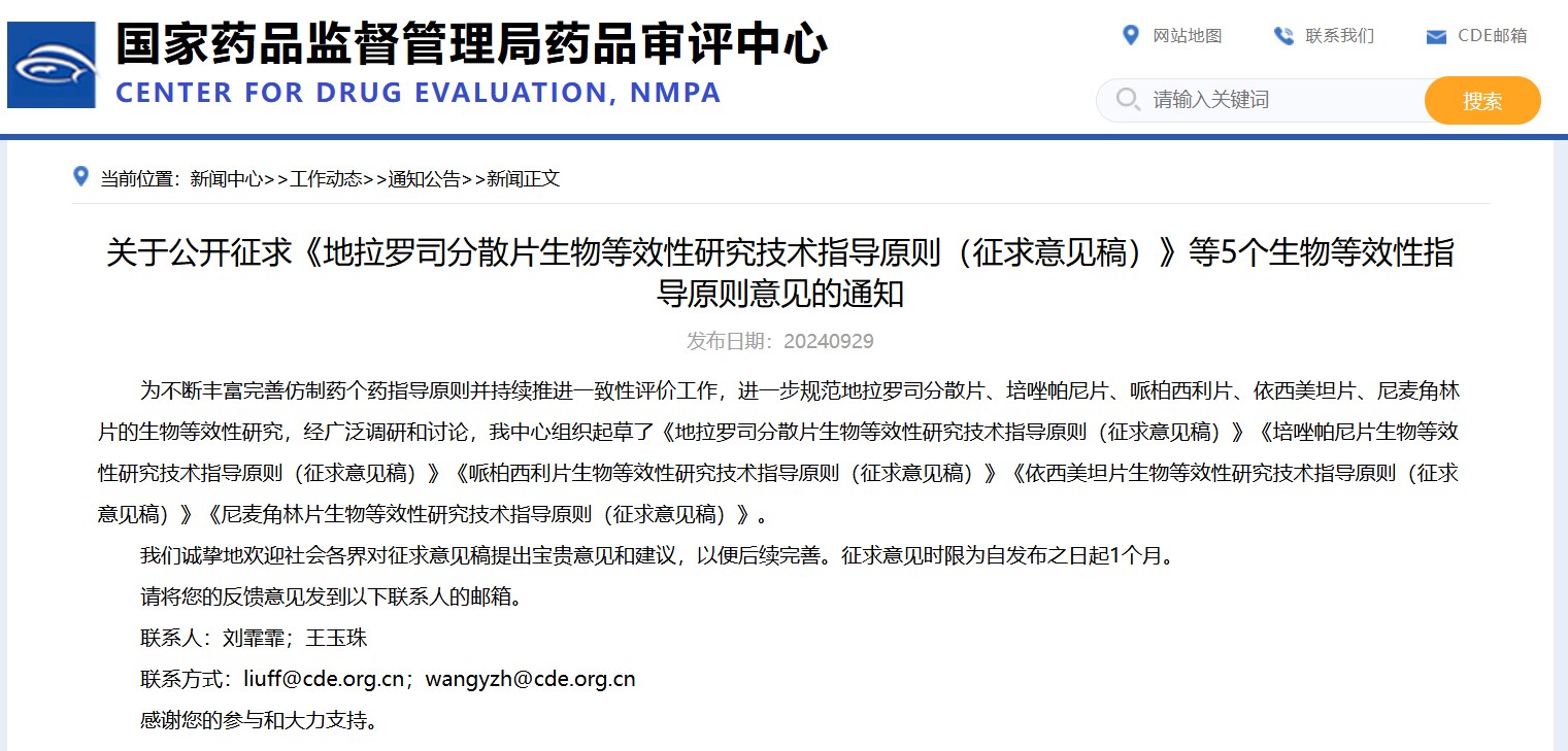 關(guān)于公開征求《地拉羅司分散片生物等效性研究技術(shù)指導(dǎo)原則(征求意見稿)》等5個(gè)生物等效性指導(dǎo)原則意見的通知