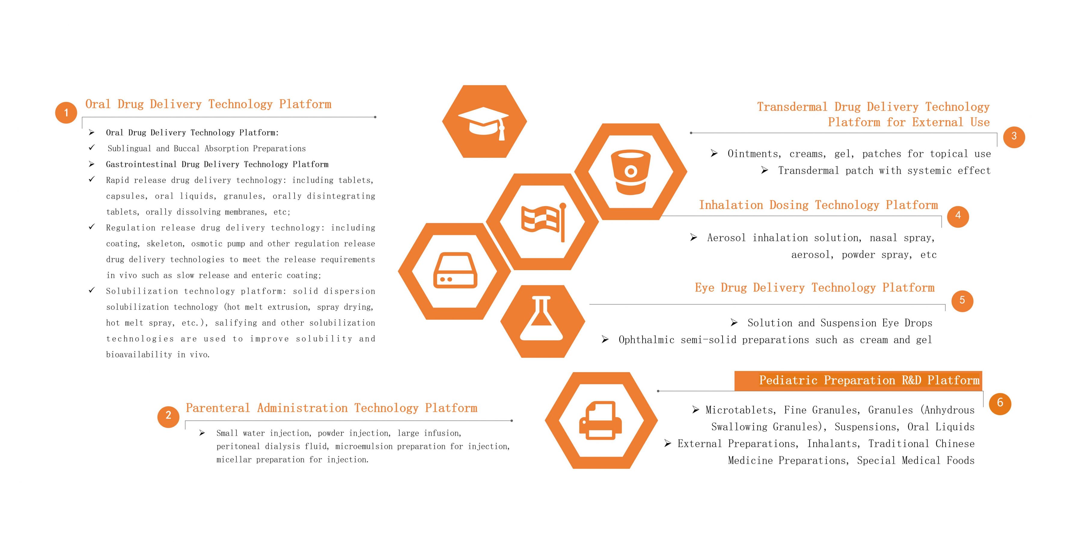 The platform has carried out the research and development of several chemical drugs for external use and two Class II new drugs for external use. The projects under research include Loxoprofen Sodium Patch, Amorofen Hydrochloride Liniment, Lidocaine Dicaine Cream, Lidocaine Tetracaine Cream, Pimecrolimus Cream, Criborol Ointment, Lidocaine Gel Patch, Fentanyl Transdermal Patch, Fusidic Acid Cream, Minoxidil Topical Solution, Metronidazole Gel, etc.