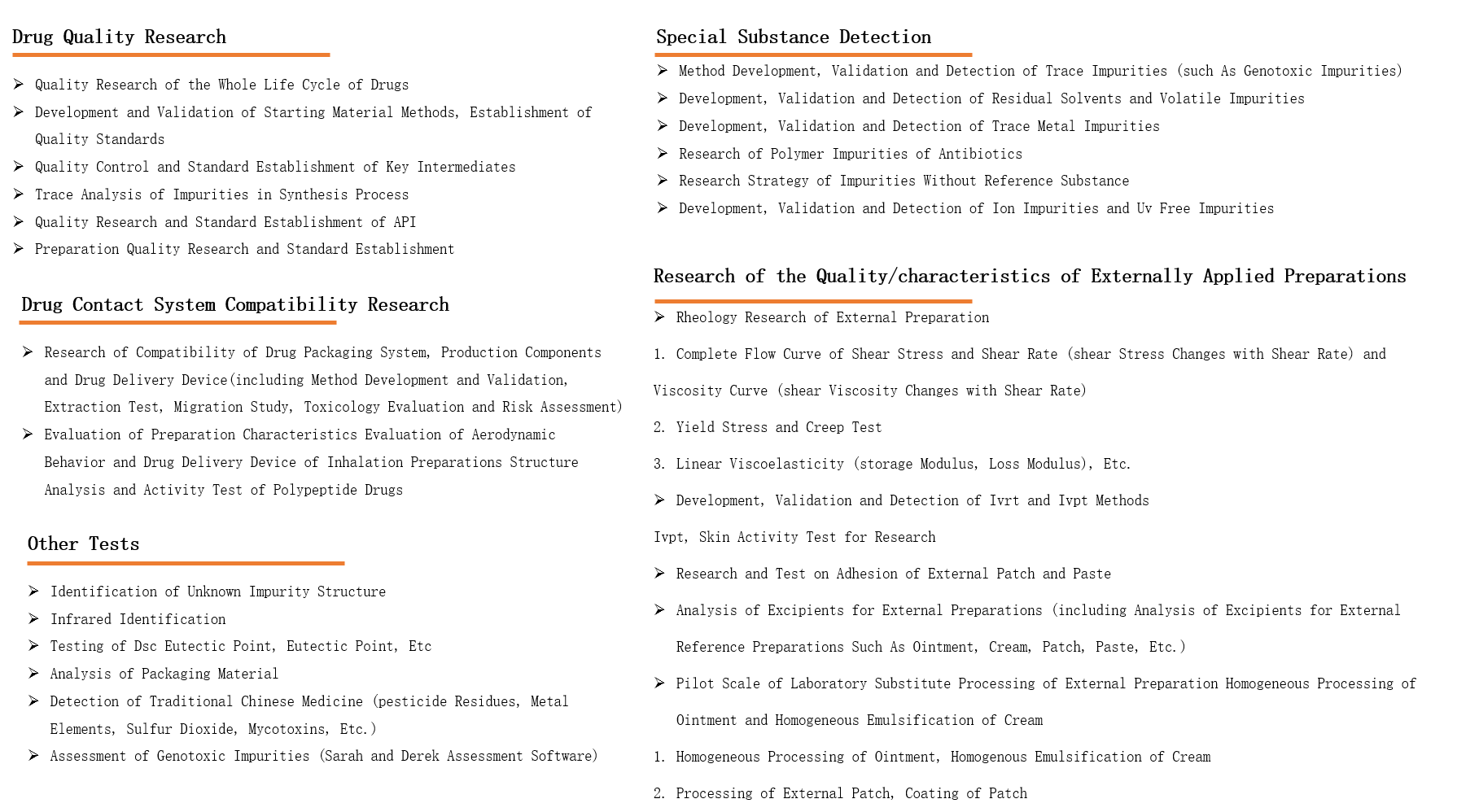 The Analytical Testing Center can provide testing technical services to domestic and foreign pharmaceutical enterprises, and has accumulated rich experience in drug quality research, mainly providing research and testing services that meet the requirements of NMPA, FDA, EMA and other regulations, such as the analysis of trace substances, genotoxic impurities, element impurities, residual solvents, polymer impurities, complex preparation excipients, as well as drug contact system compatibility research. The Center has successively passed the ISO9001 Quality Management System Certification and the Laboratory Accreditation Qualification of China National Accreditation Service for Conformity Assessment(CNAS)Business Scope